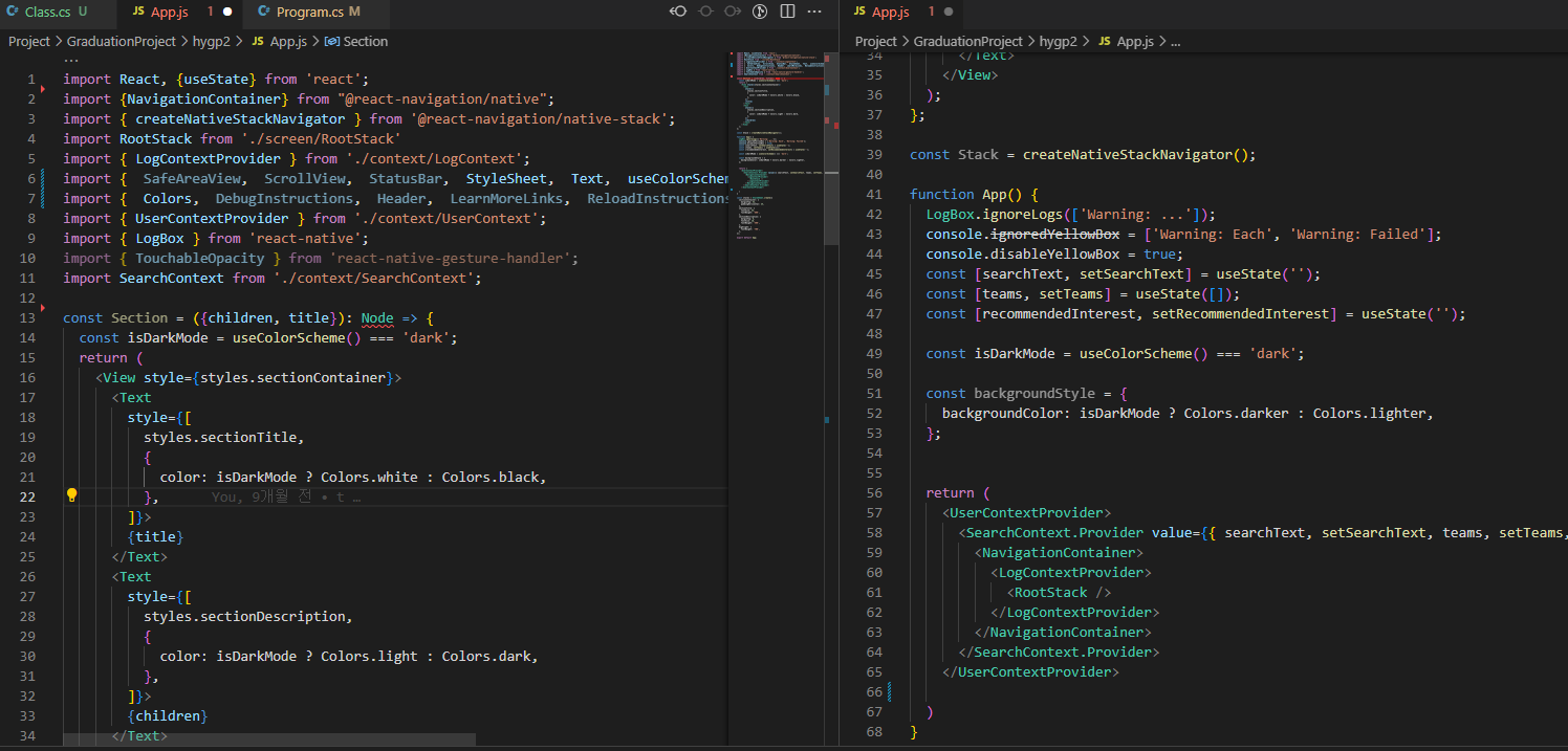 또 다른 방법이 있다 IDE (Visual Studio)를 사용하면 된다. 비주얼 스튜디오에서는 .NET프로젝트에 대해 하나의 프로젝트 솔루션(최상위 폴더 : FirstApp)안에 있는 cs파일이라면 자동으로 추적하여 namespace 파일을 찾아서 using문에 포함시킬 수 있도록 개발되어있기 때문에 개발자는 이런 파일 경로를 RN처럼 경로를 지정할 필요가 없이 그냥 using문으로 포함시키기만 하면 된다.