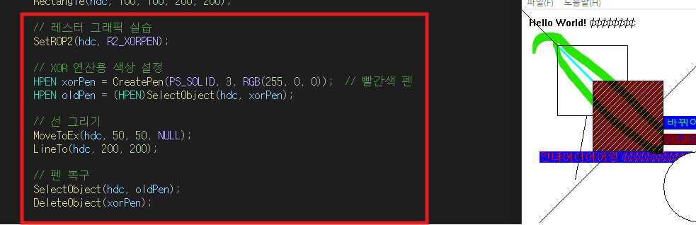 HPEN xorPen = CreatePen(PS_SOLID, 3, RGB(255, 0, 0)); // 빨간색 펜