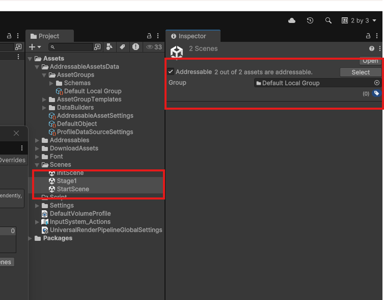 그 다음 기존 씬을 선택해보면 인스펙터 창에 어드레서블이라는 체크박스가 생긴것을 확인할 수 있다. 이것을 활성화 해주면 씬파일이 어드레서블화 된다.
