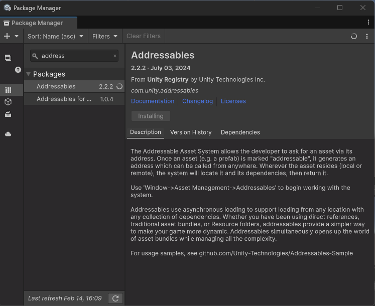 우선 어드레서블이라는 기능을 사용하려면 Unity Registry에서 제공하는 Addressables라는 패키지를 다운로드 받아야 한다.