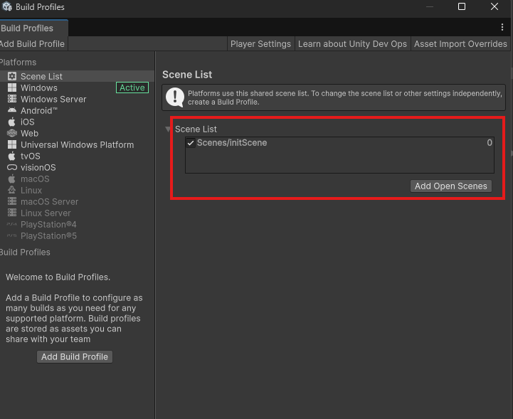 우선 다음과 같이 씬 리스트에서 기존씬들을 모두 제거하고 초기화 씬만 등록해 놓는다.