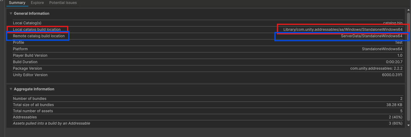 - AddressablesBuildTEP.json: 빌드 성능 데이터를 로깅합니다. 자세한 내용은 빌드 프로파일링을 참조하십시오.