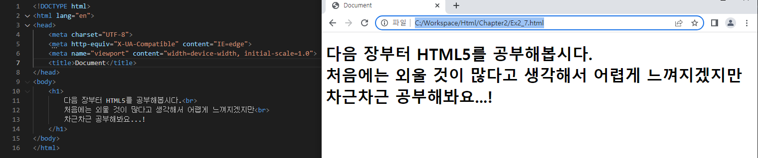 ⇒ <link rel="stylesheet" href="outer_stylesheet.css"></link> - 아직 어떤 HTML 태그가 어떤 기능을 하는지 배우지 않았지만, 기본 예제를 입력하면서 h1이라는 태그를 사용하면 크고 굵은 글씨를 출력할 수 있음을 알았을 것입니다. 이를 활용해서 간단한 생각을 표현해 보세요.