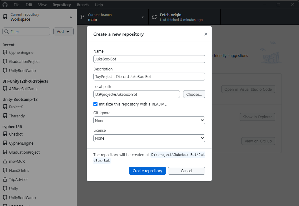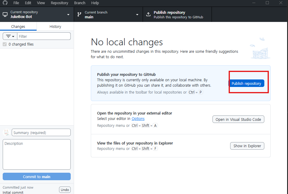 간단하게 설명하자면 깃허브 데스크탑으로 Create a new repository버튼을 통해 기존에 있는 로컬 디렉터리를 업로드했다.