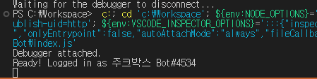 이제 디버깅을 시작하면 다음과 같이 터미널에 메세지가 출력되면서 디스코드 봇이 활성화된다.