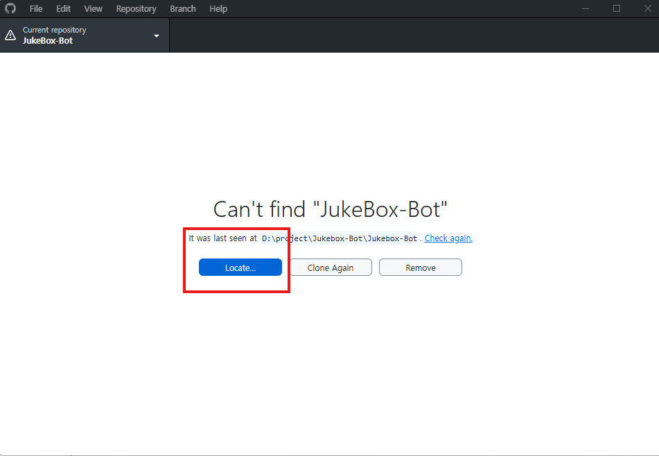 그러면 다음과 같이 레포지토리를 못찾는다고 나오는데 경로 다시 설정해주면된다.