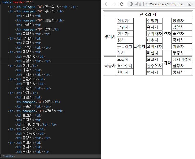 HTML5의 table은 행단위로 데이터를 입력하기 때문에 우선 행 기준으로 data를 입력한 뒤 다음 라인에서span속성 값에 따라 자동으로 웹 브라우저가 간격을 맞춰 채워준다.