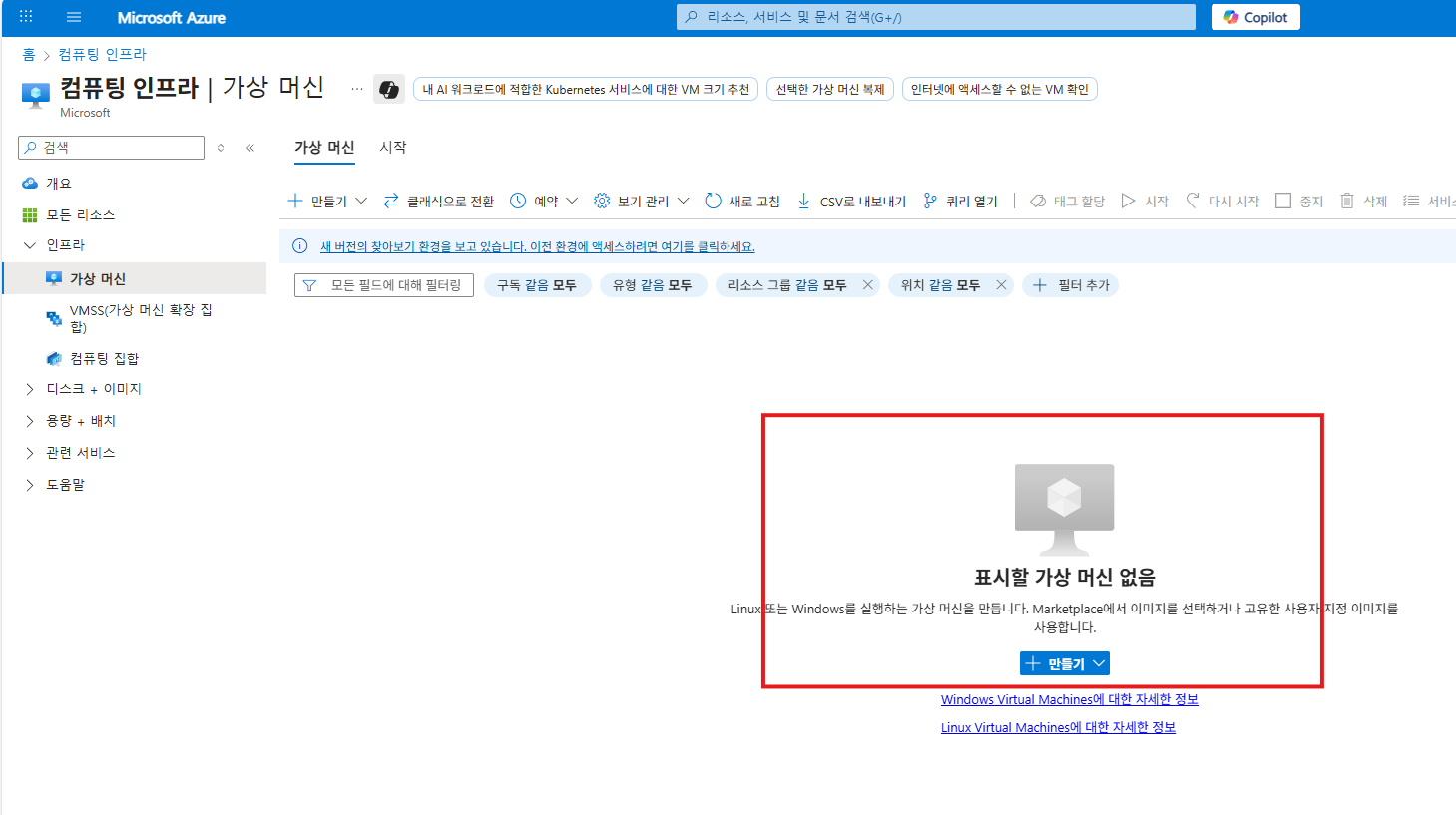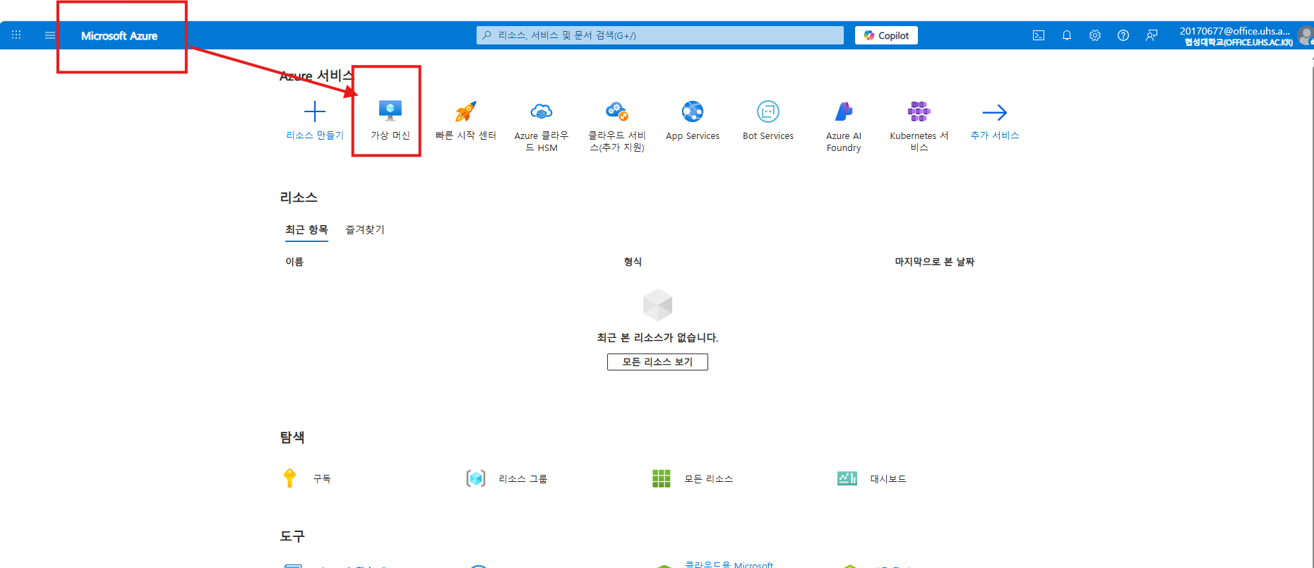 우선 홈으로 들어가서 가상머신 서비스를 눌러 VM서비스 페이지로 들어가서 가상머신을 하나 만들어준다.