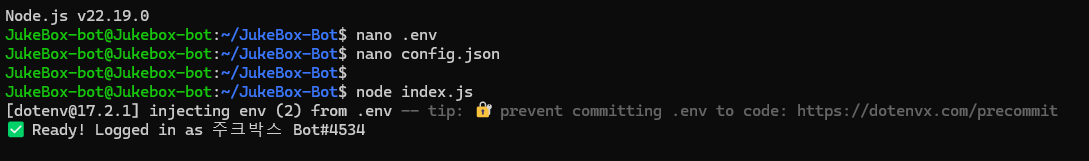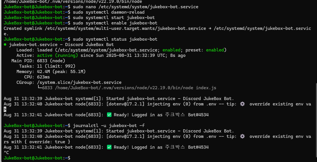 Aug 31 13:46:55 Jukebox-bot node[7300]: ✅ Ready! Logged in as 주크박스 Bot#4534