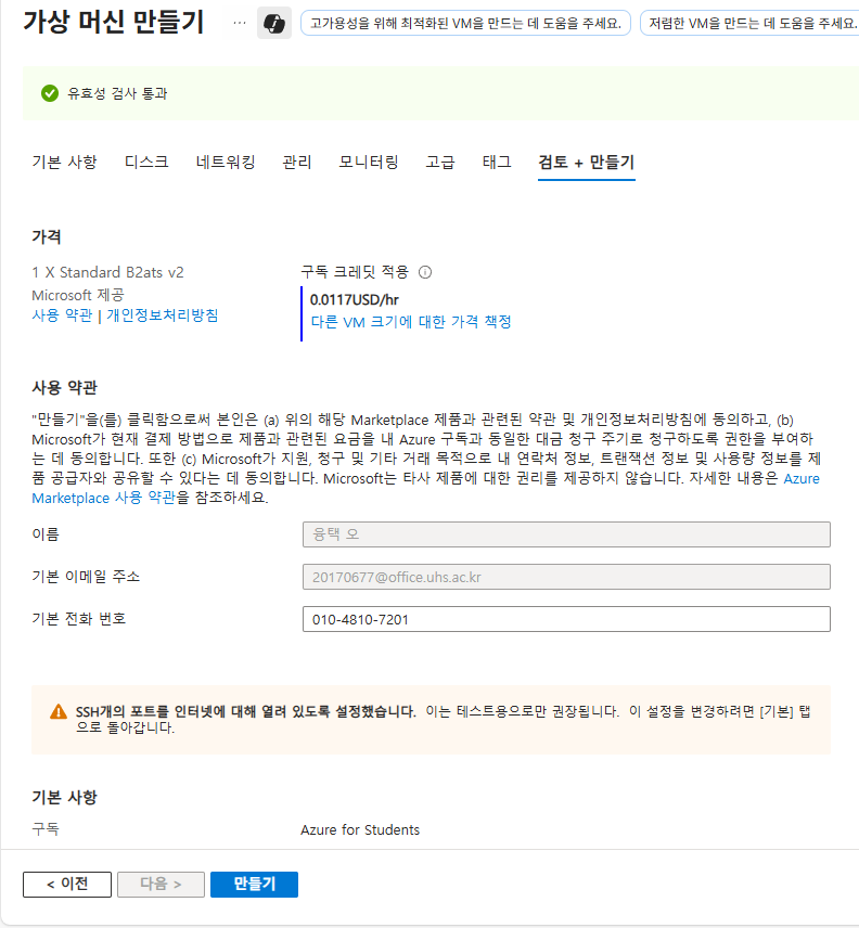 나는 학교에서 MS Office For Student를 지원받고 잇기에 되나 해봣는데 일단 학교 인증만 되면 100$가량의 크레딧을 1년간 이용할 수 있게 해준다.