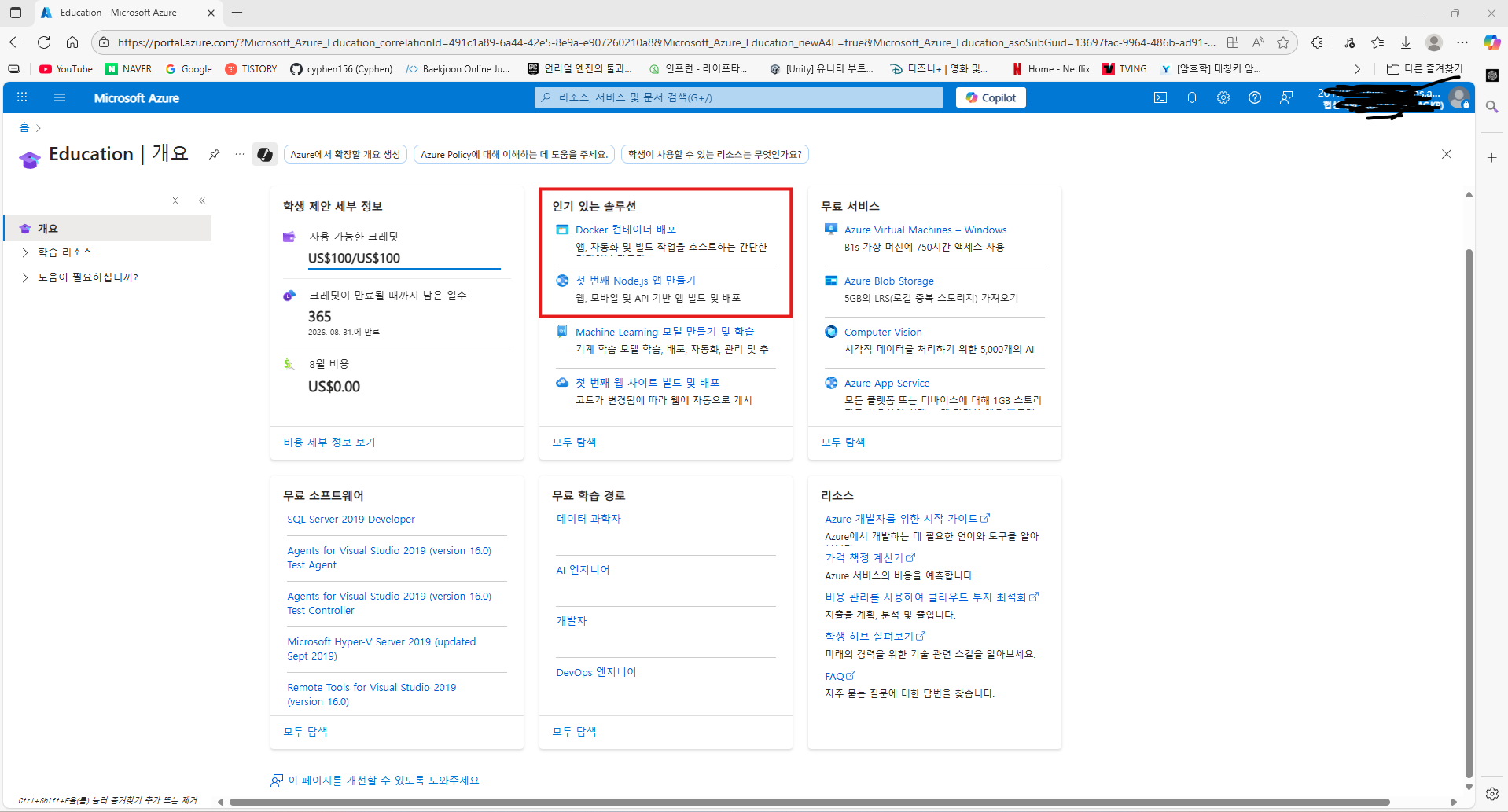 Microsoft Azure for Students에서 체험 계정을 만들면 USD 100 크레딧을 받을 수 있습니다. 신용 카드가 필요 없으며 Azure 평가판 서비스를 12개월 동안 사용할 수 있습니다.