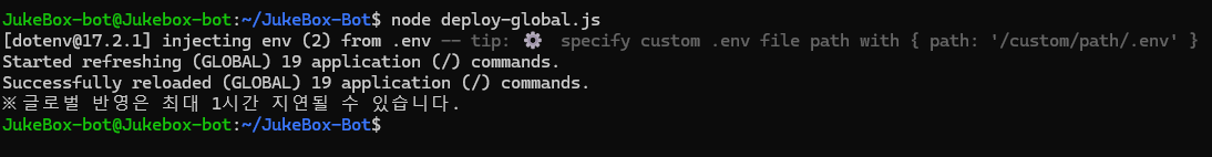 이제 마지막으로 모든 서버에서 명령어를 사용할 수 있도록 명령어 커맨드를 글로벌로 배포한다.