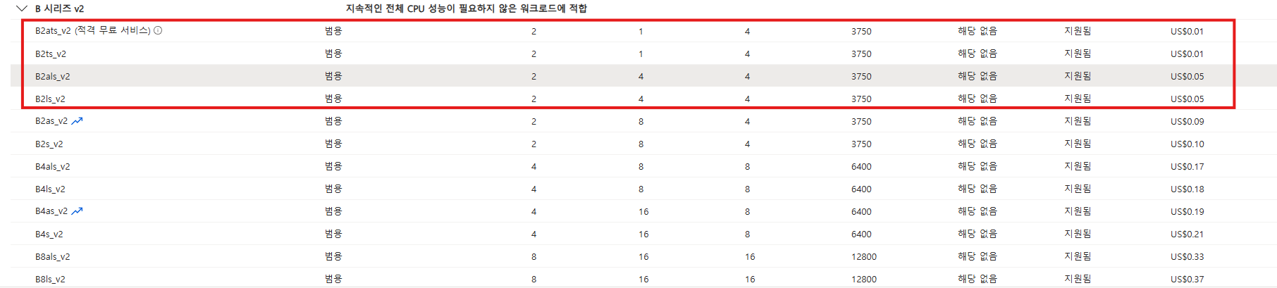 그렇기 때문에 우리는 상시 CPU 사용을 풀 로드로 가용할 수 있는 D서비스가 아닌, B시리즈를 2개의 코어와 1GB의 데이터를 사용하는 가상머신을 선택하기로 한다.