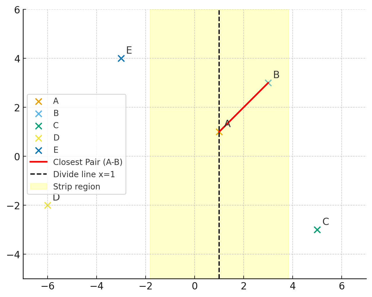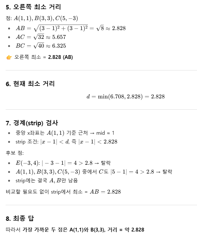 구해진 거리를 기준으로 stripe 범위를 형성하여 분할 축에 대해 y좌표를 올려가면서 최소 거리(d)를 갱신한다.