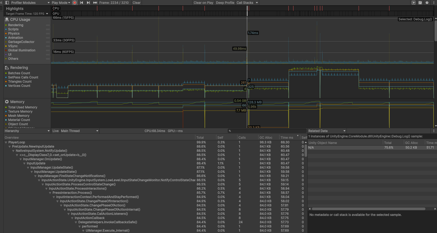 보면 평균적으로 유니티의 인풋 시스템과 이벤트 시스템에 의해 실행되는 타이밍에는 코드 실행이 550ms으로 확 튀는걸 볼 수 있다.